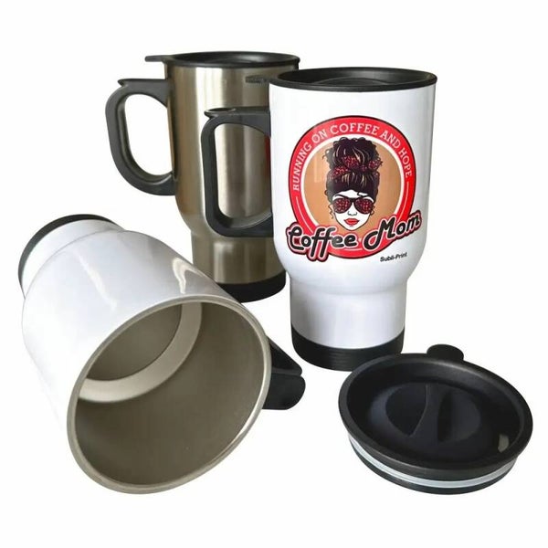 Ideal für unterwegs - der Subli-Print® Reisebecher aus doppelwandigem Edelstahl mit Deckel und Kunststoffhenkel, erhältlich in weiß und silber.